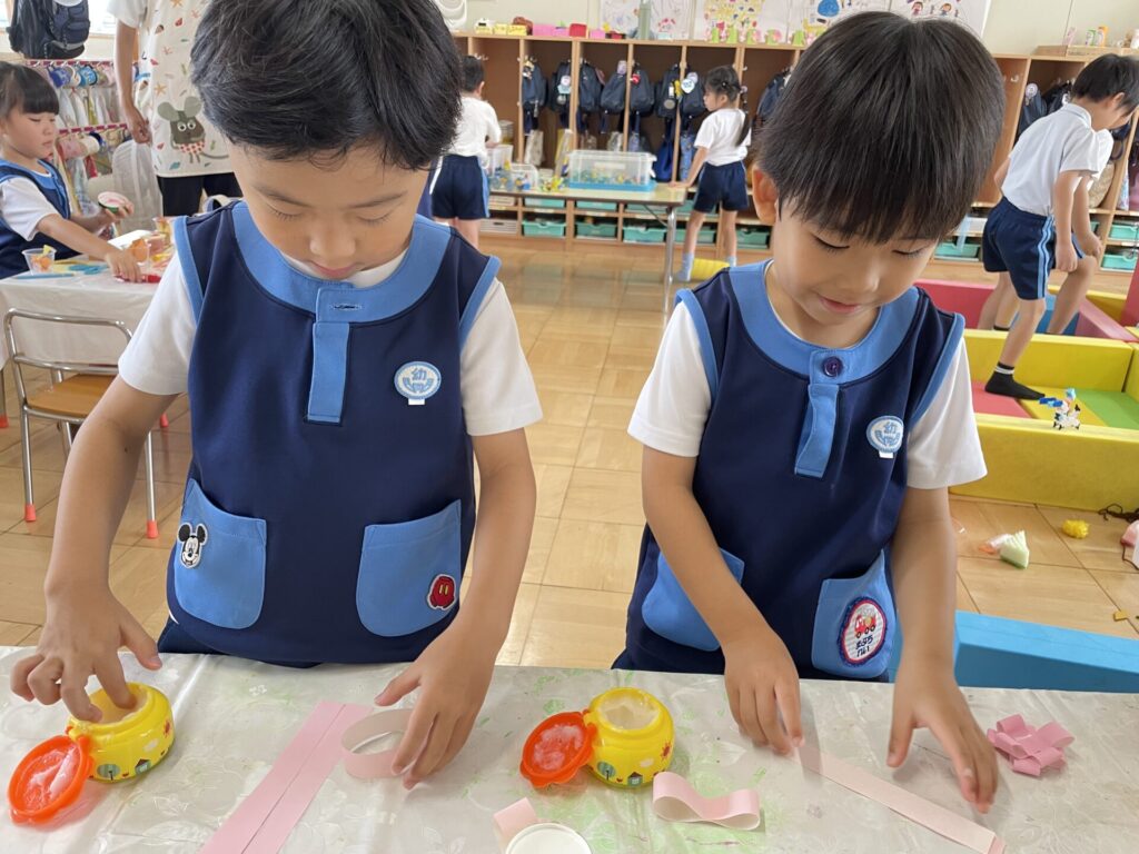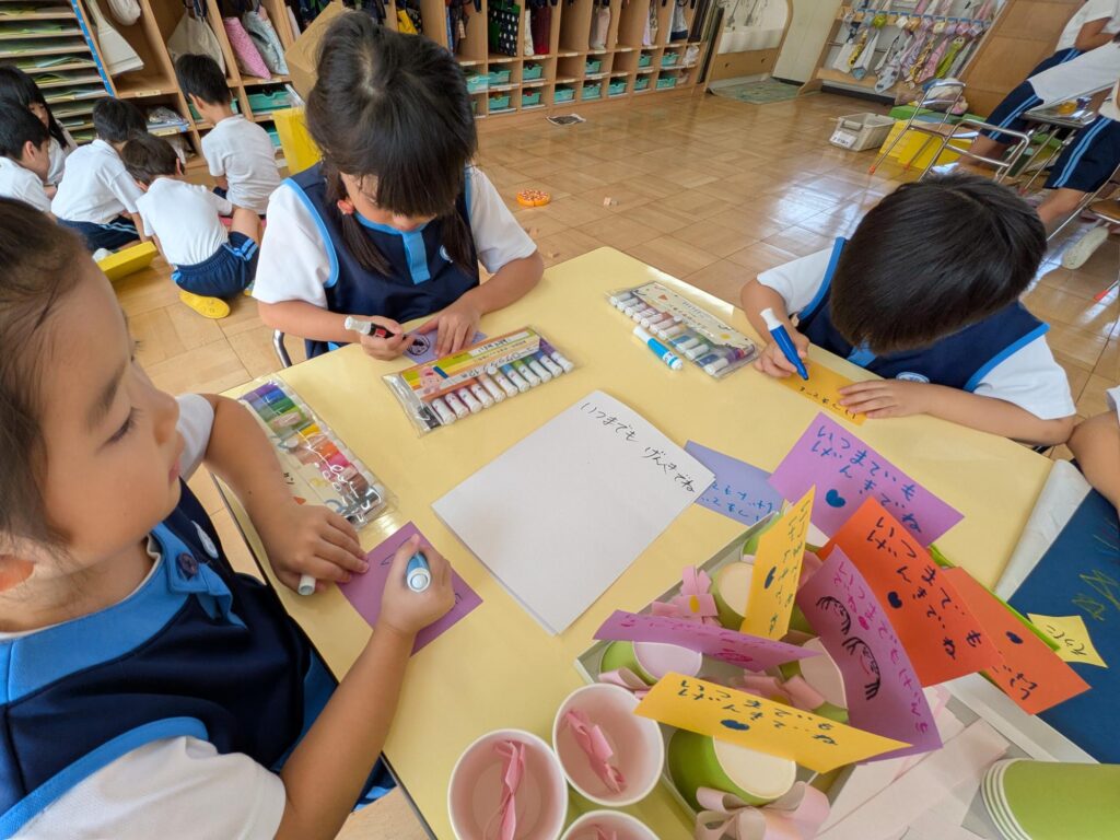 利用者の方々へのプレゼントを作る時には、「前作ったから作れるよ!」「いつもありがとうって書く!」など自分で考えて作る姿が見られました。