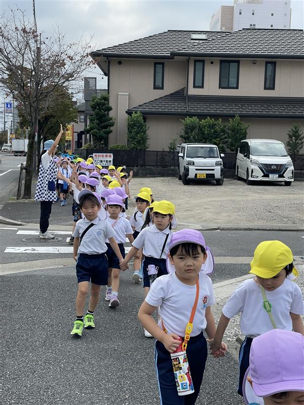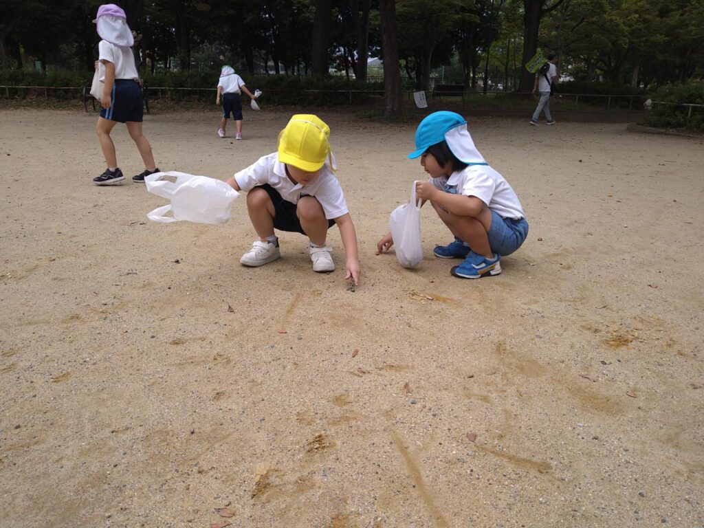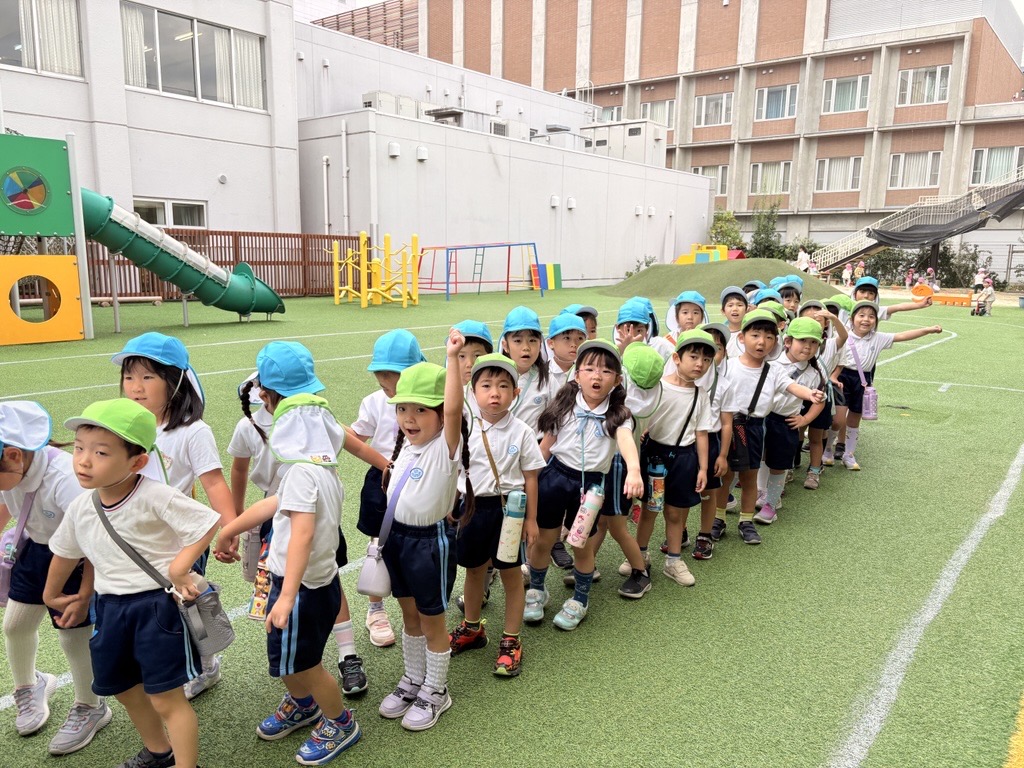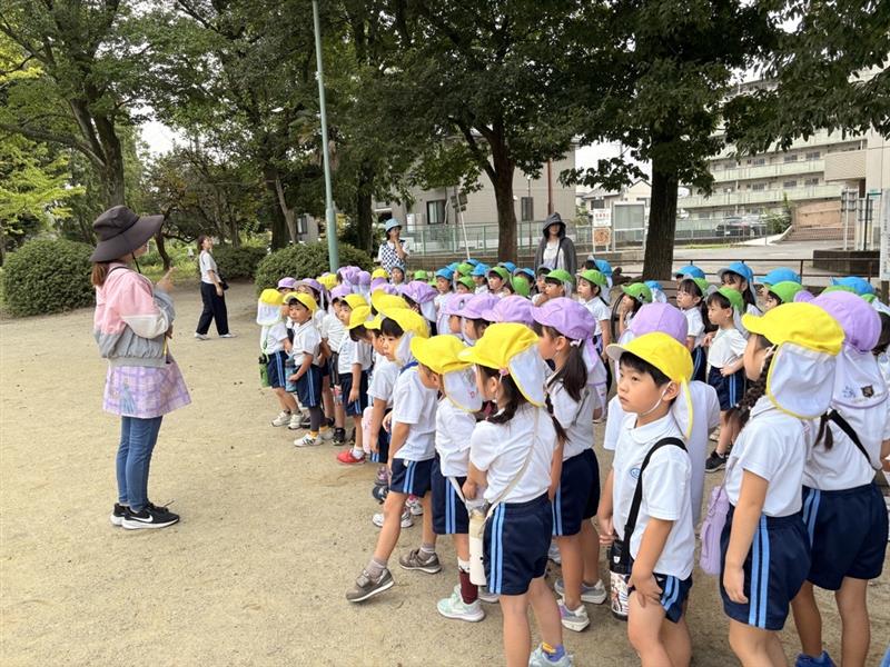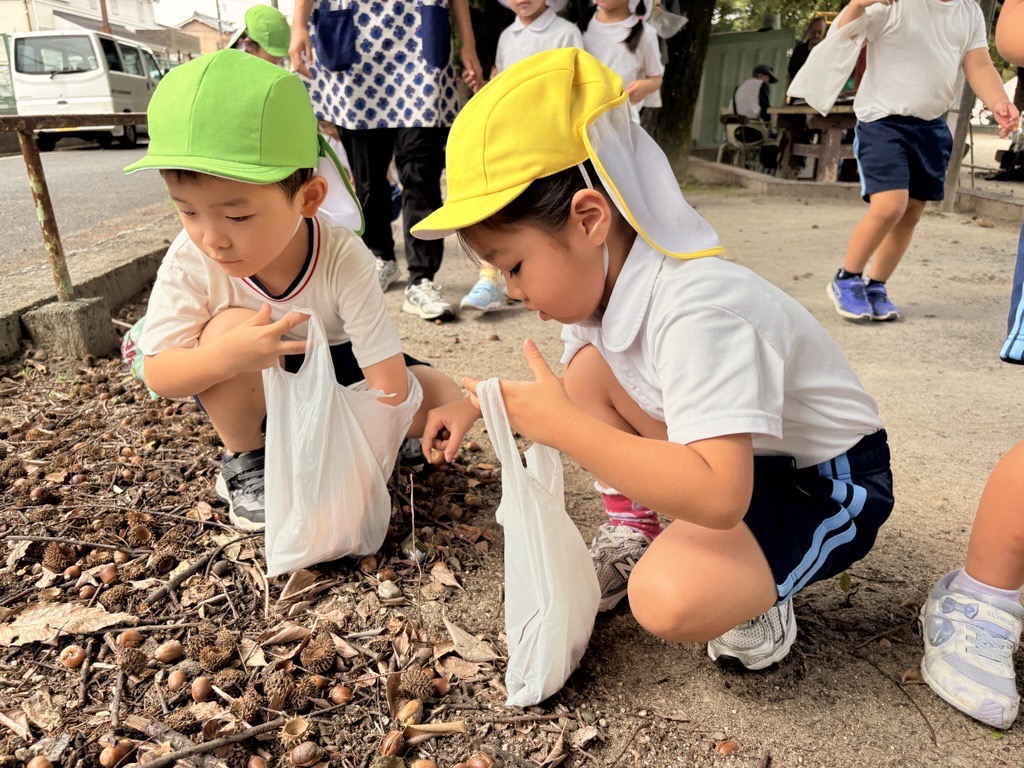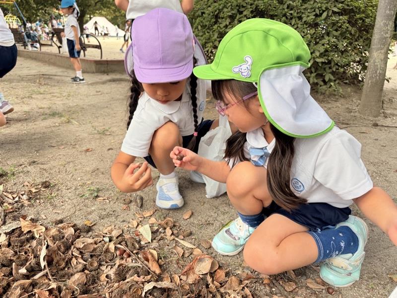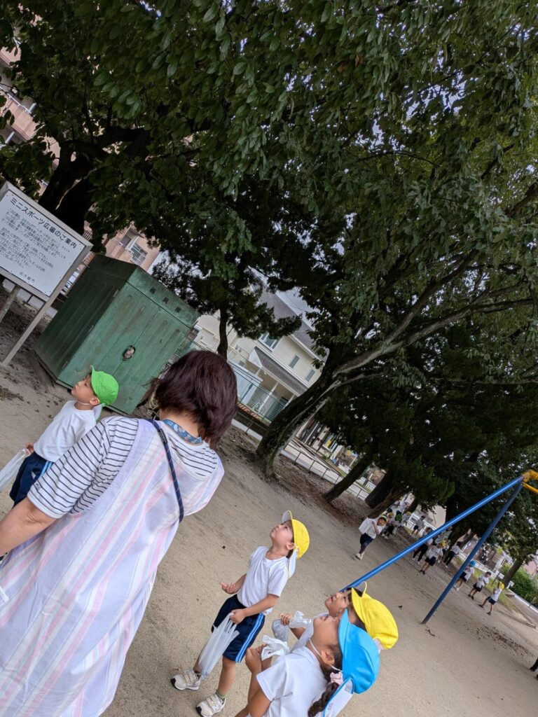 年中組と年長組で一緒に稲葉地公園にどんぐりを拾いに行ってきました!1学期ぶりに一緒に散歩に行き、以前よりもしっかりとした足取りで行くことができました。
