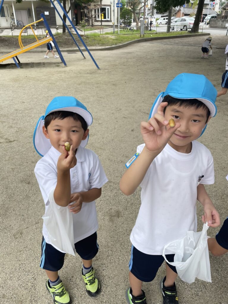 公園に着き、約束事を聞いた後、ドングリ拾いスタート!いろいろな形や大きさのドングリをたくさん見つけました。珍しい色のドングリを見つけると友達に教えたり、一緒に探したりました。