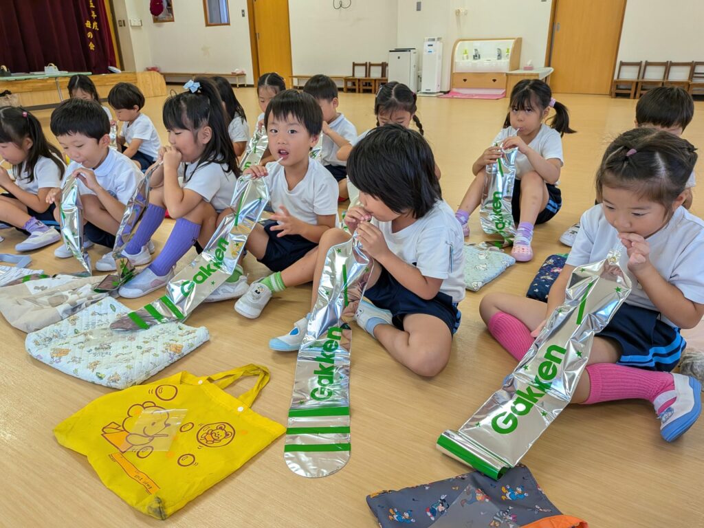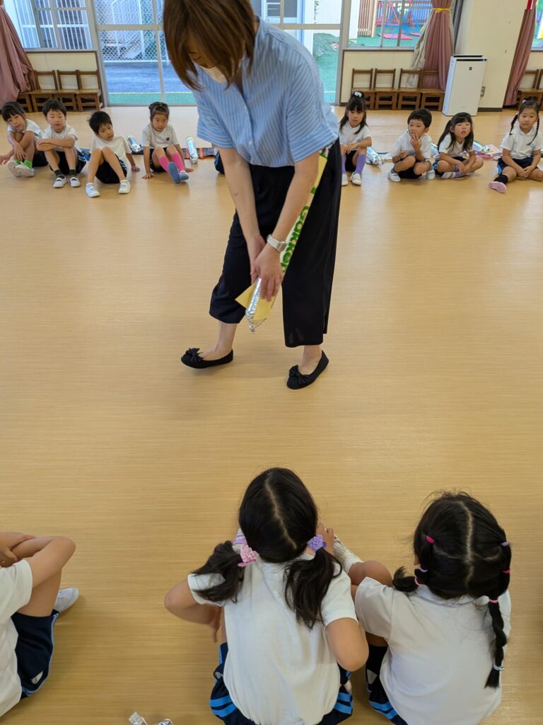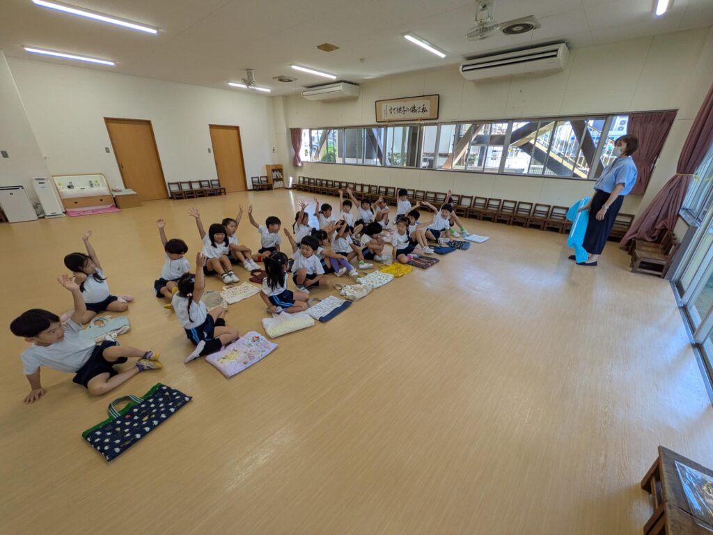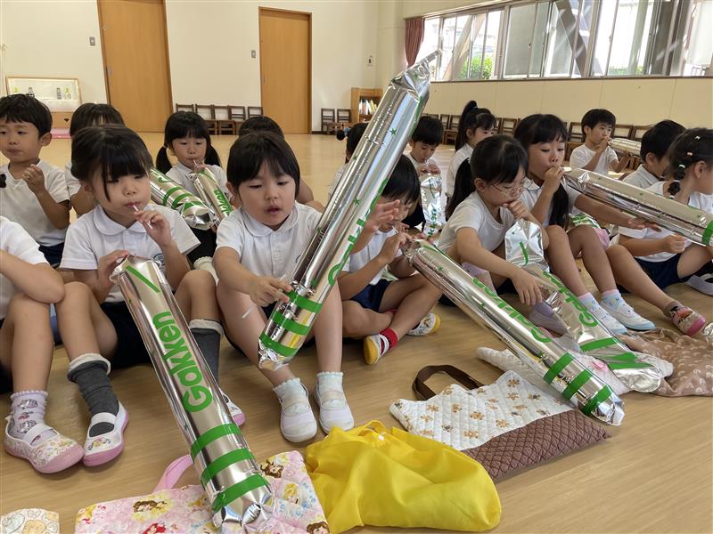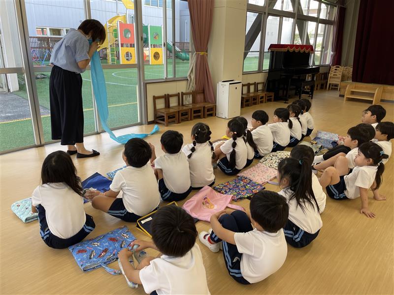「どうしたらここに空気が入れられるかな?」の問いかけに、「風」「ドライヤー」など様々な意見が出ました。