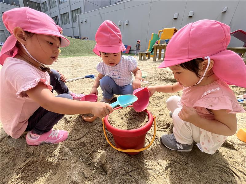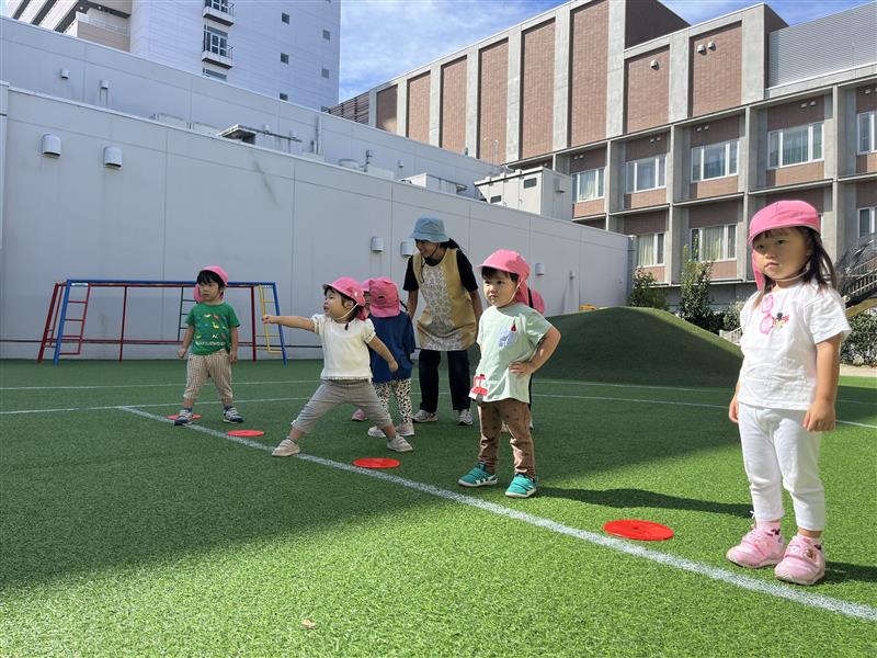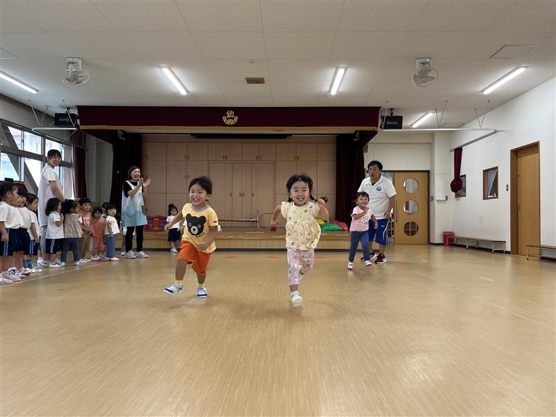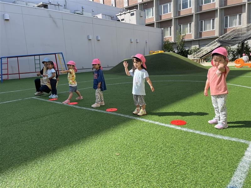 年長や年中組の走る姿を応援したり、友達の走る姿を見て刺激を受けたりして、「もう1回やりたい!」「今日はよーいどん!する?」と日に日に体を動かすことが楽しくなってきたひよこ組の子どもたちです。皆、元気いっぱい遊んでいます!