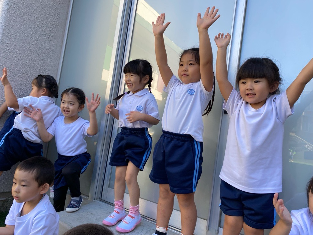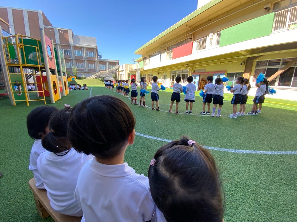 子ども達にとって初めての「運動会」です。年少組も9月中旬から体操教室でかけっこに触れ始め、10月に入る頃から運動会で踊る遊戯の曲をクラスで踊ったり、2クラスで合わせて外で踊ったり、遊びの中でも曲をかけて楽しみながら、取り組んできました。
