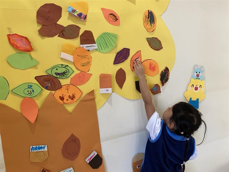 秋の壁面で、折り紙を使ってどんぐりを折りました。遊びの中でも折り紙や画用紙を使って葉っぱを作り、どんぐりや葉っぱでいっぱいにした木を作りました。