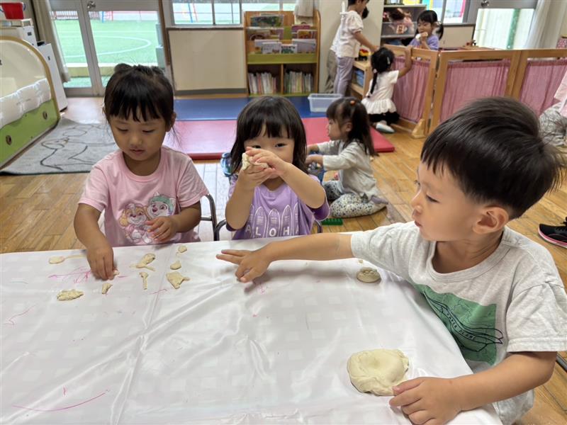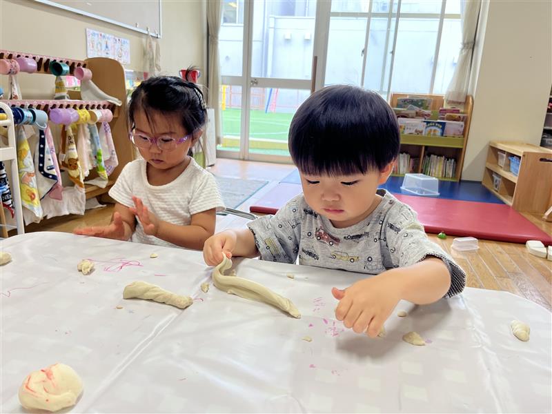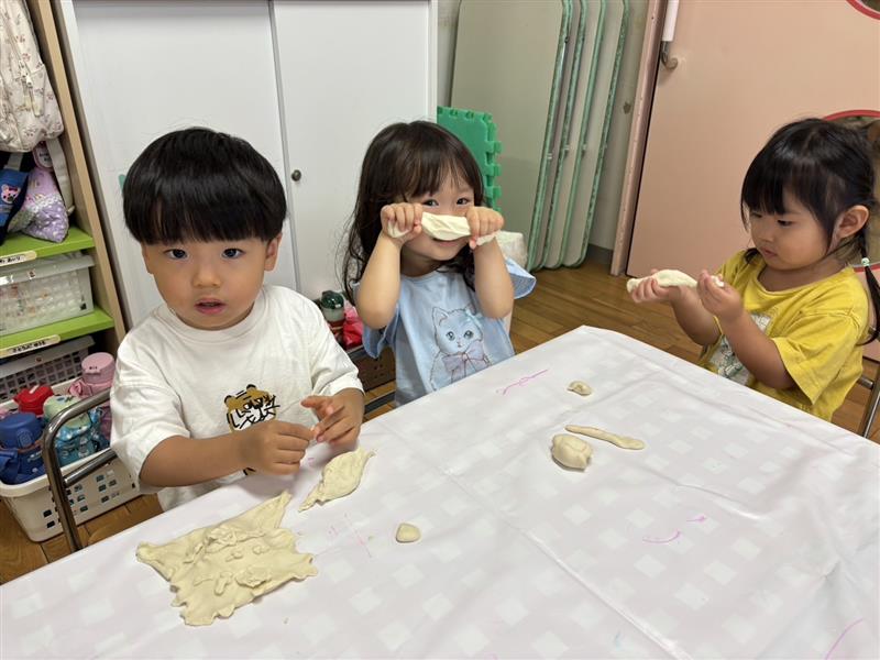 小麦粉粘土で遊んでいます。ふわふわして気持ちいいね。