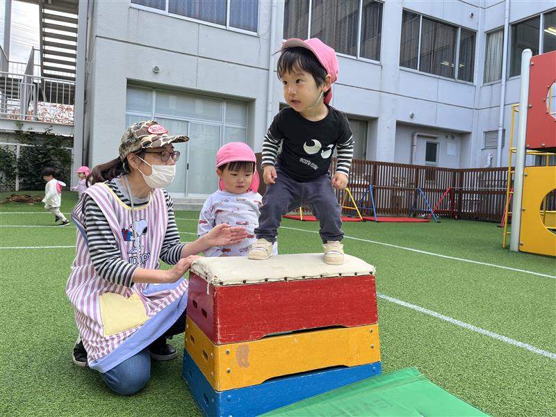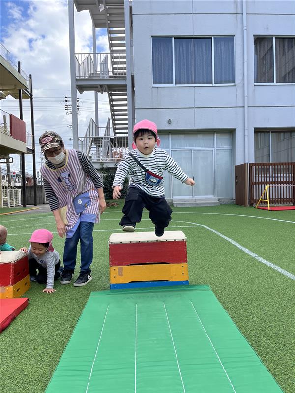運動会後は、お兄さん、お姉さんのしていたことを真似て挑戦です。大きく足は開かないけれど、上手にジャンプできるよ!
