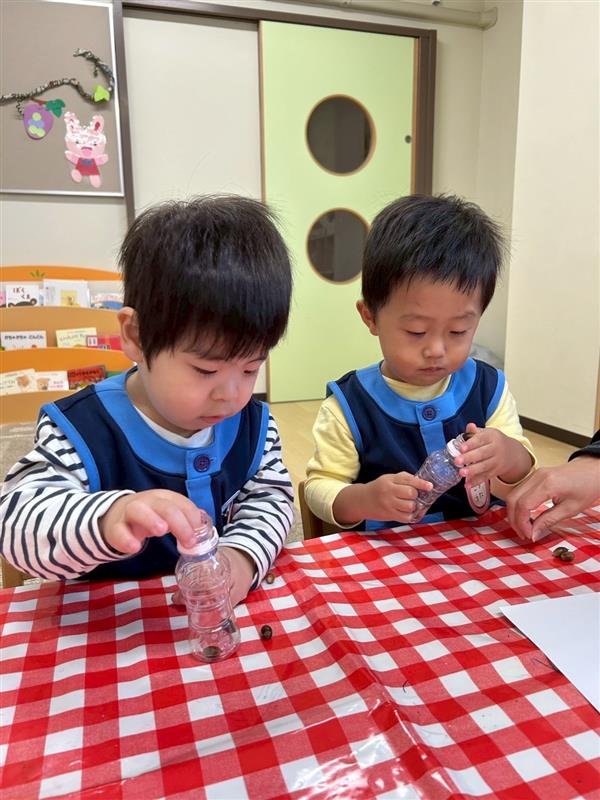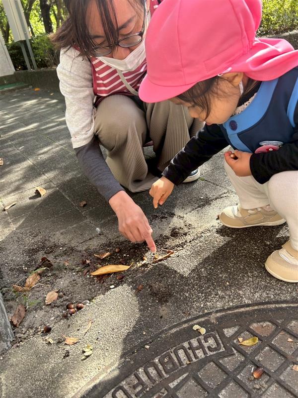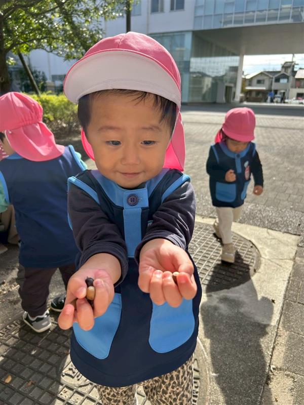 「いい形のどんぐりがあったよ!」細長いどんぐりや丸いどんぐりなどいろいろな形のどんぐりを見つけていました☆