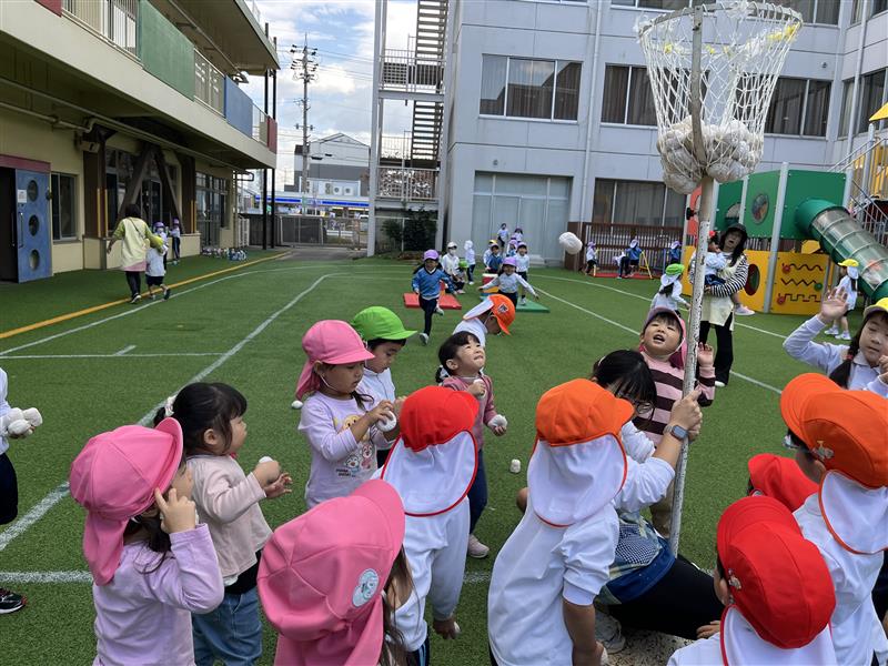 お兄さんお姉さんと一緒に玉入れ☆高くてとどかないよ~!