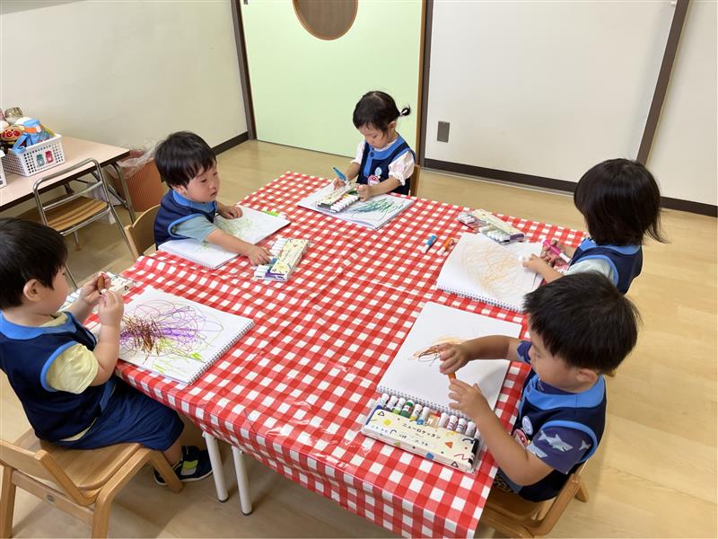 自由画帳にマーカーでお絵描き。手首をくるくる動かして紙いっぱいに描きます。