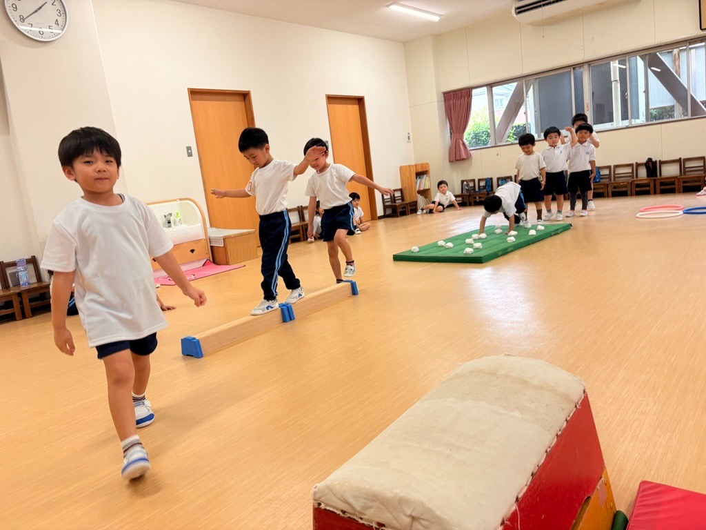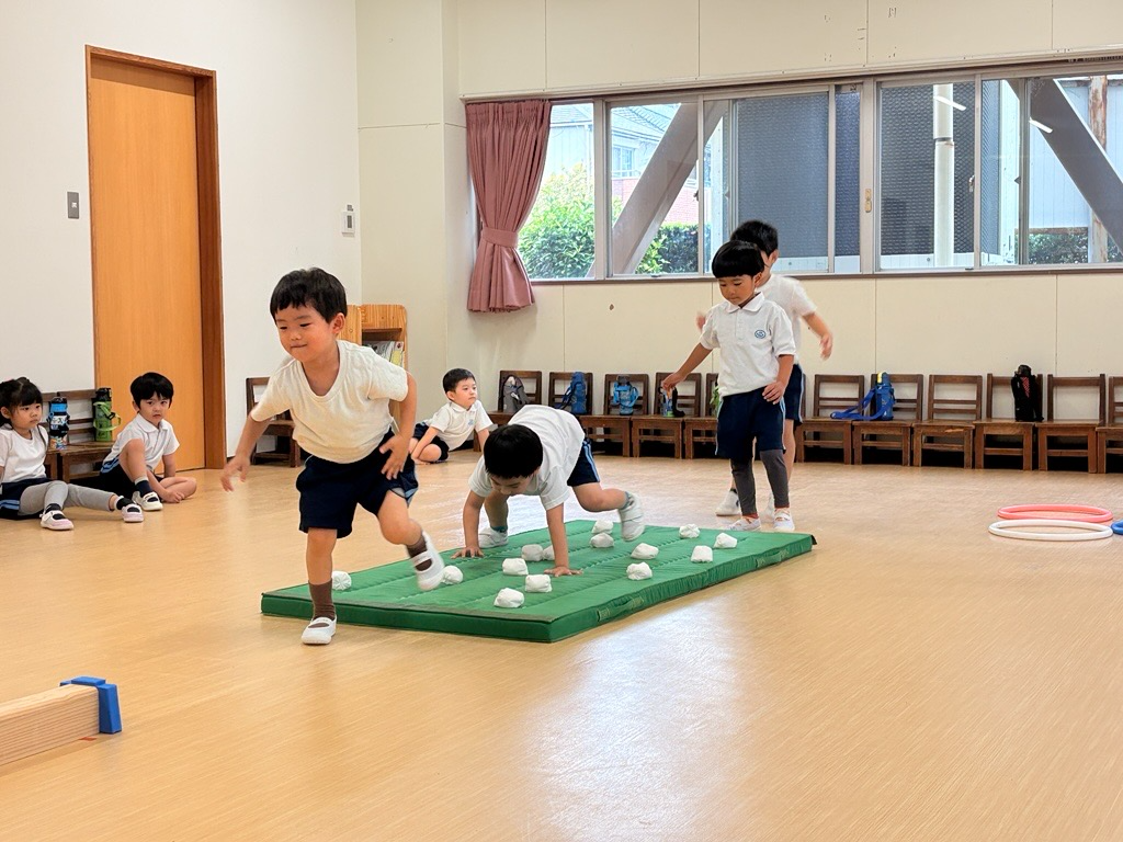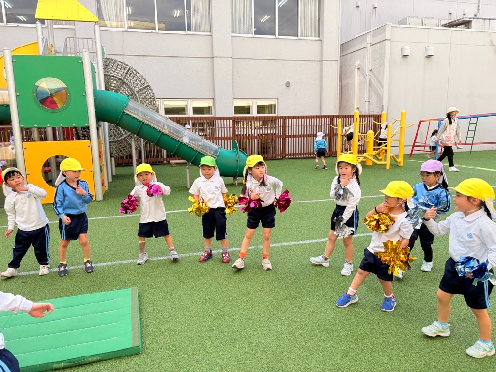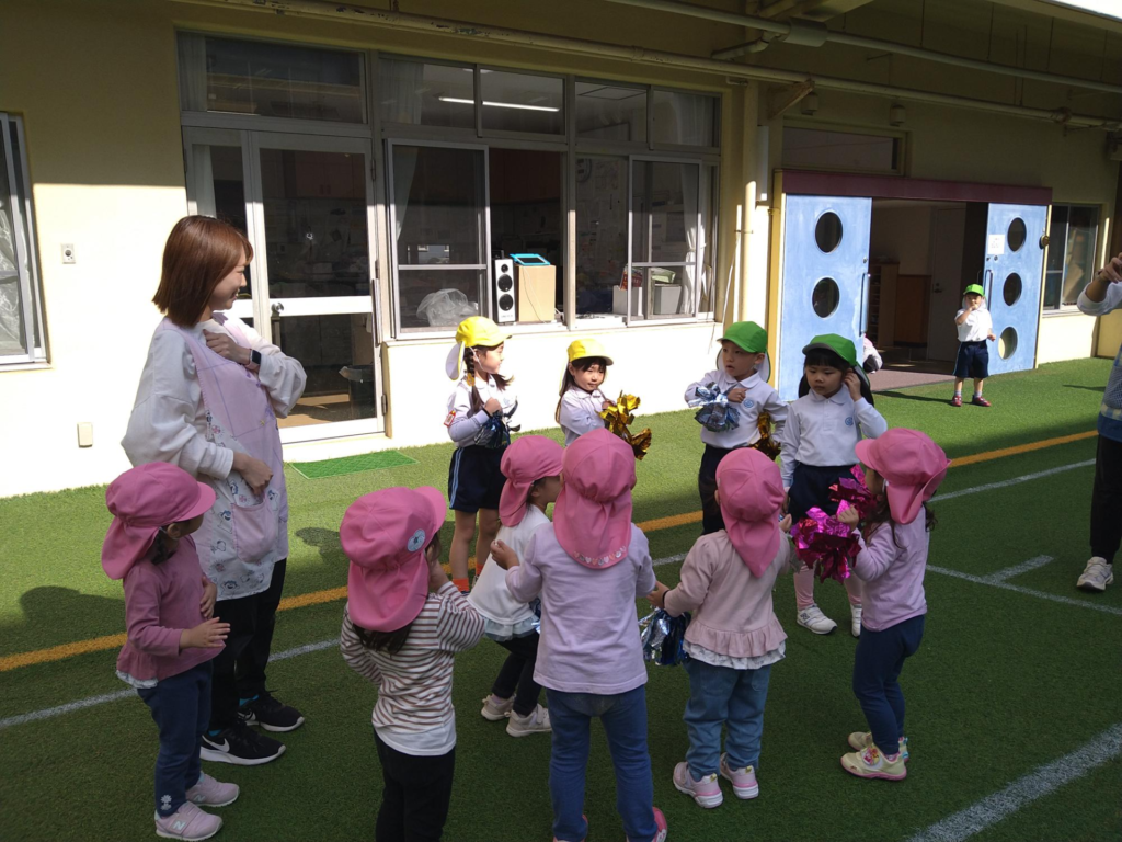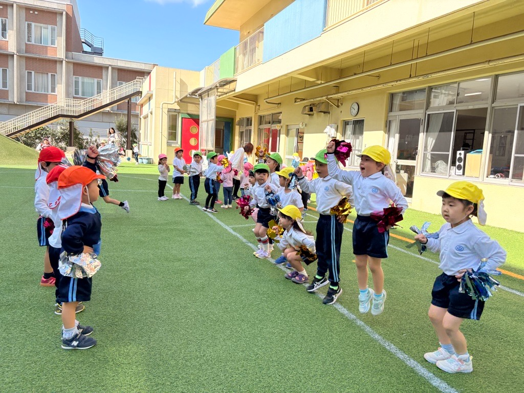 運動会当日はお忙しい中観覧いただきまして、ありがとうございました。子ども達は、お父さんお母さんに観てもらう日をとても楽しみにしていました。玉入れの練習で連敗が続いた時は、どう声を掛けるべきか悩みましたが、子ども達はとても前向きで「お父さんに玉を上手く入れる方法を聞いてきたよ!」と皆に教えてくれたり、上手く入れられる子の投げ方を真似たりして、最後まで諦めずに皆でがんばりました。当日は緊張している子もいましたが、それぞれ今できることをやりきってくれた姿が嬉しかったです。運動会以降は異年齢のクラスと交流しながら、運動会の余韻を楽しんでいます。
