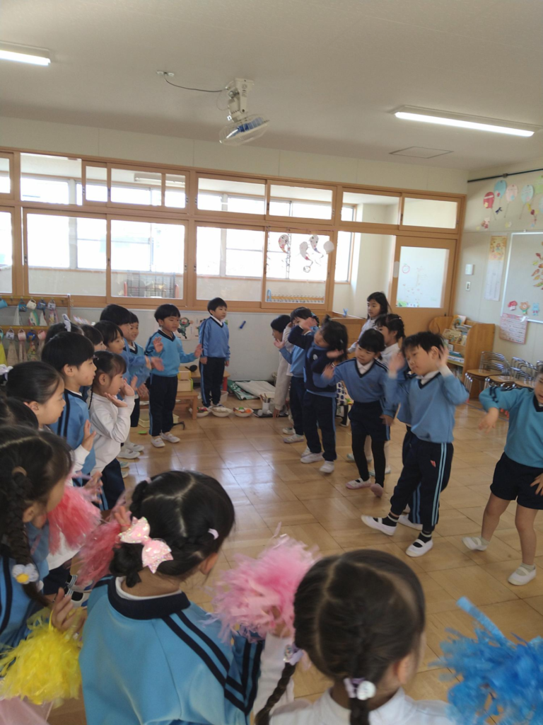 年長組さんに「Rock this Party」の踊りを教えてとお願いすると、きりん組の部屋にきてくれました。皆嬉しくなって、違う遊びをしていた子も集まり、大賑わいで踊りました。
