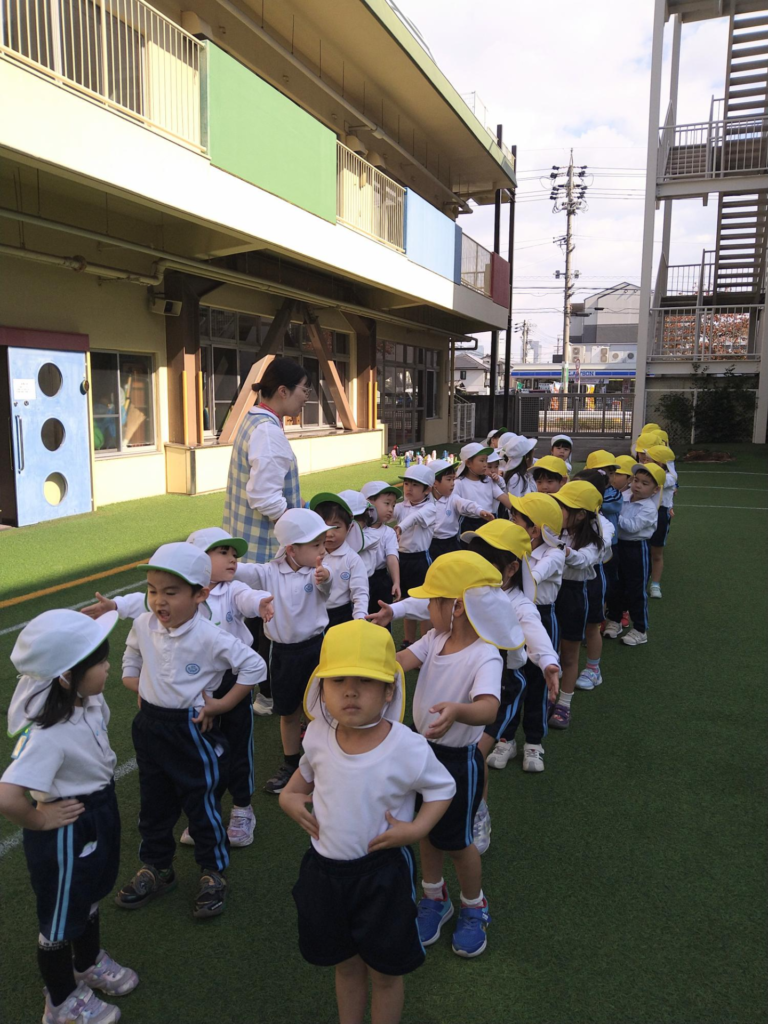 年中組さんだけでバトンリレーにチャレンジしました。バトンを受け取ったものの、走っていいのか迷ってしまったり、友達と一緒に走ることが嬉しくて速さを合わせて走ったりして、可愛らしいバトンリレーでした。年長組になった時の成長が楽しみです。