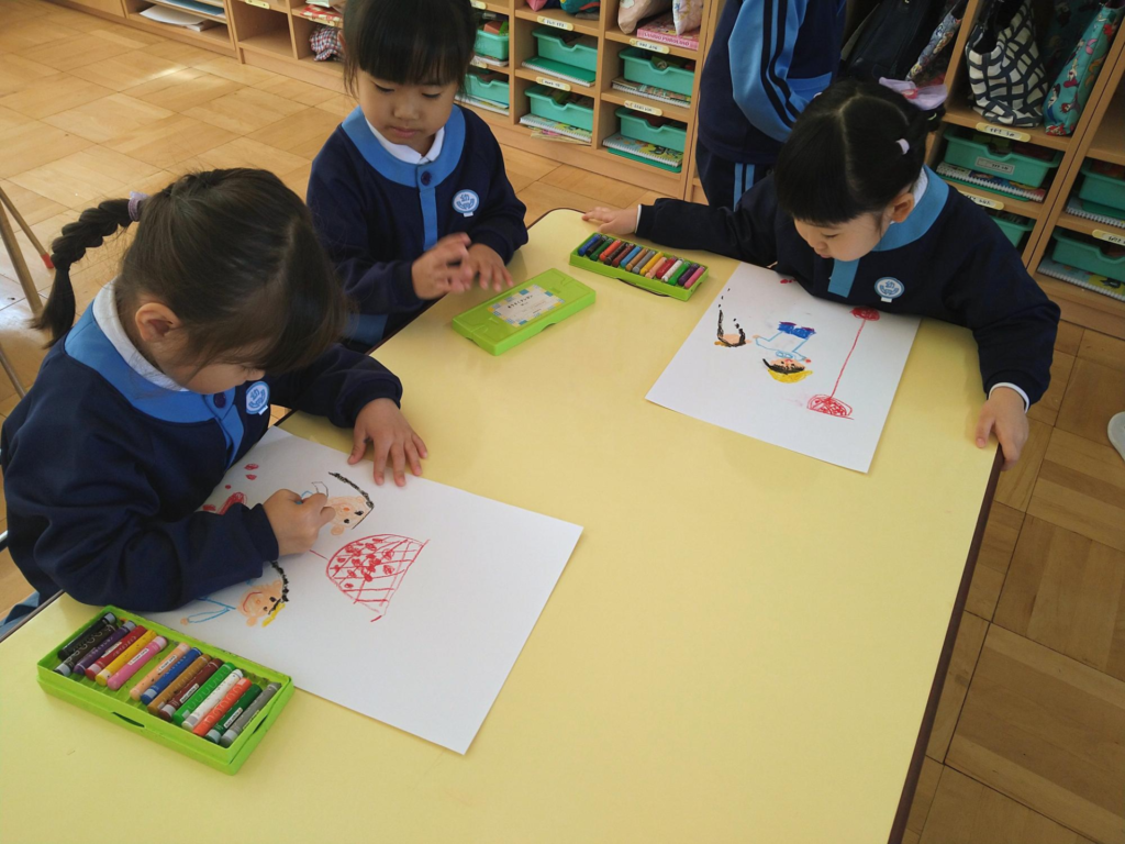 運動会の絵を描きました。「運動会で楽しかったことやがんばったことを描こう」と伝えると、多くの子が『玉入れ』の絵を描いていました。沢山玉が入って2勝できたことがとても嬉しかったね!