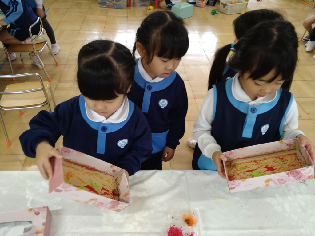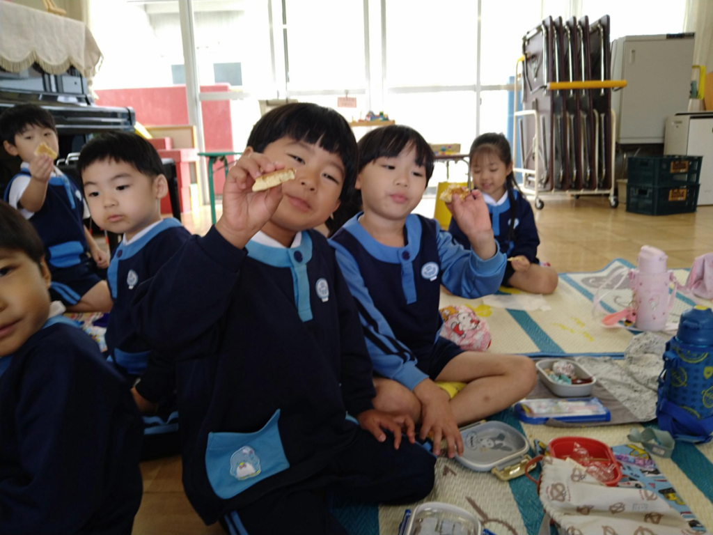 年長組さんが自分達で育てたさつま芋でパンケーキを作りました。「きりん組さんもどうぞ」とおすそ分けしてくれました。とてもおいしくて、1切れでは足りず、「もっと食べた~い」と2切れずつ食べました。次は自分達が育てる番と、育てることを楽しみにする気持ちに繋がったようです。