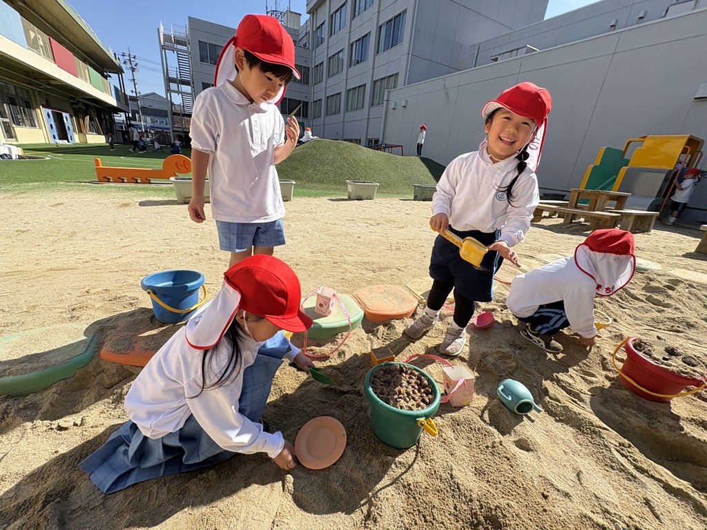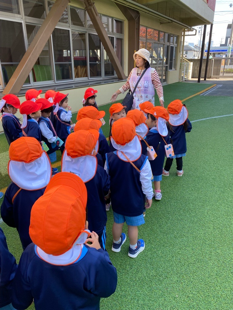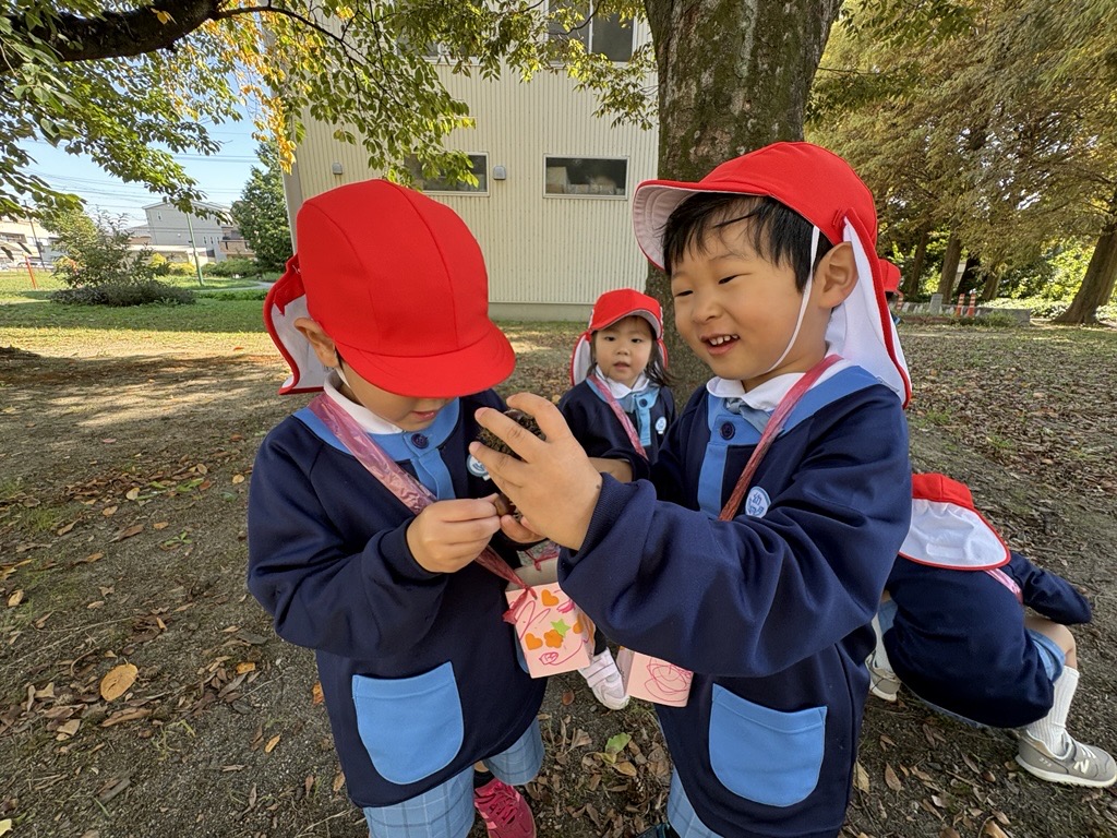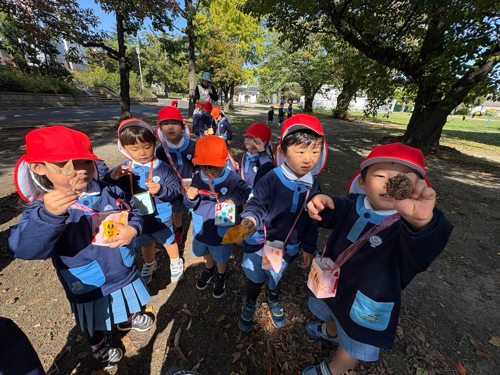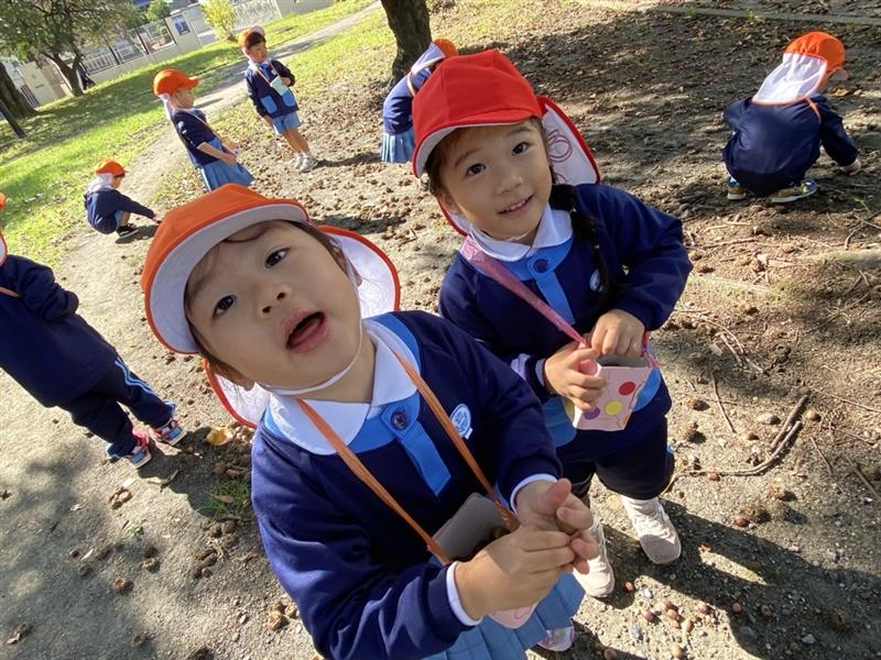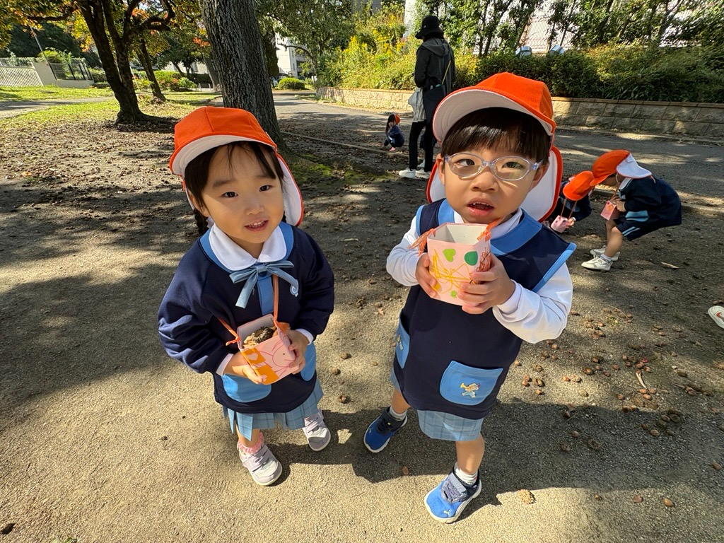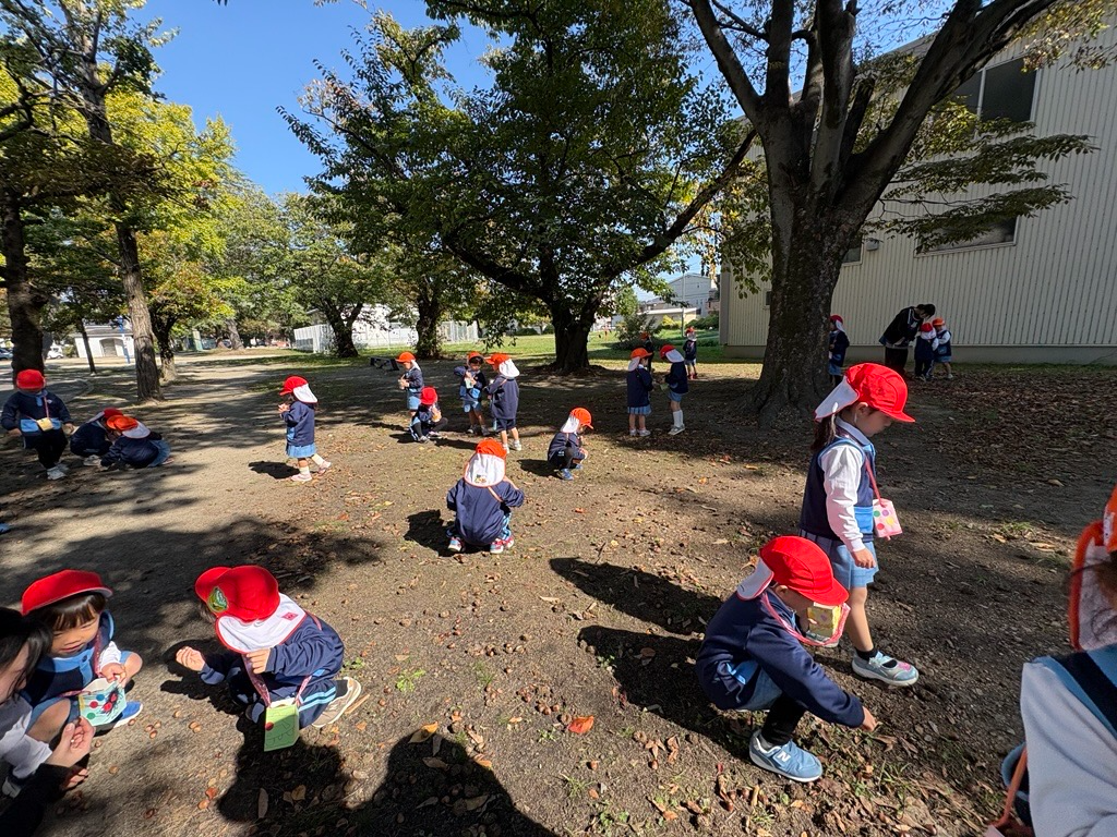皆、いたるところに落ちているどんぐりを夢中になって拾い、友達と見せ合ったり、場所を教え合ったりして楽しむことができました。拾ったどんぐりは、幼稚園で製作や遊びに活用しようと思います。