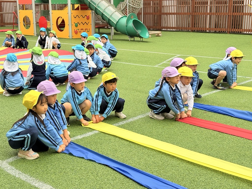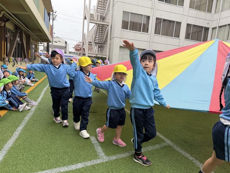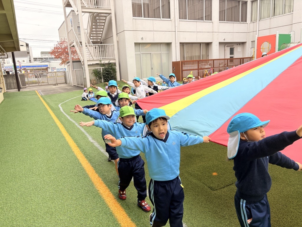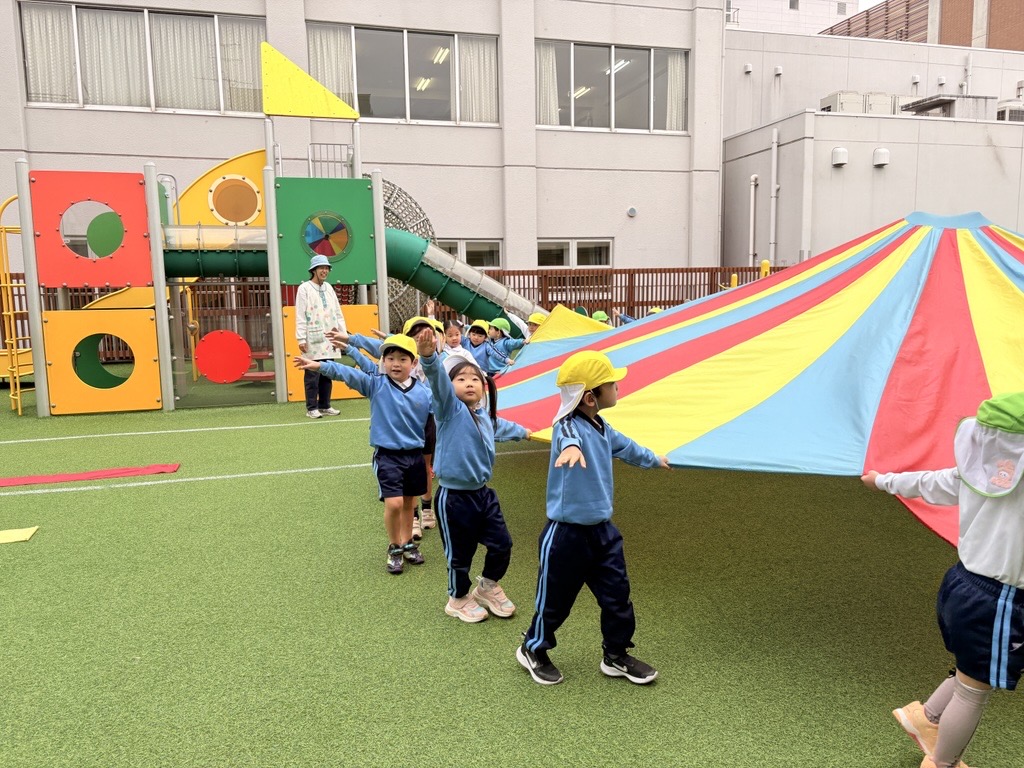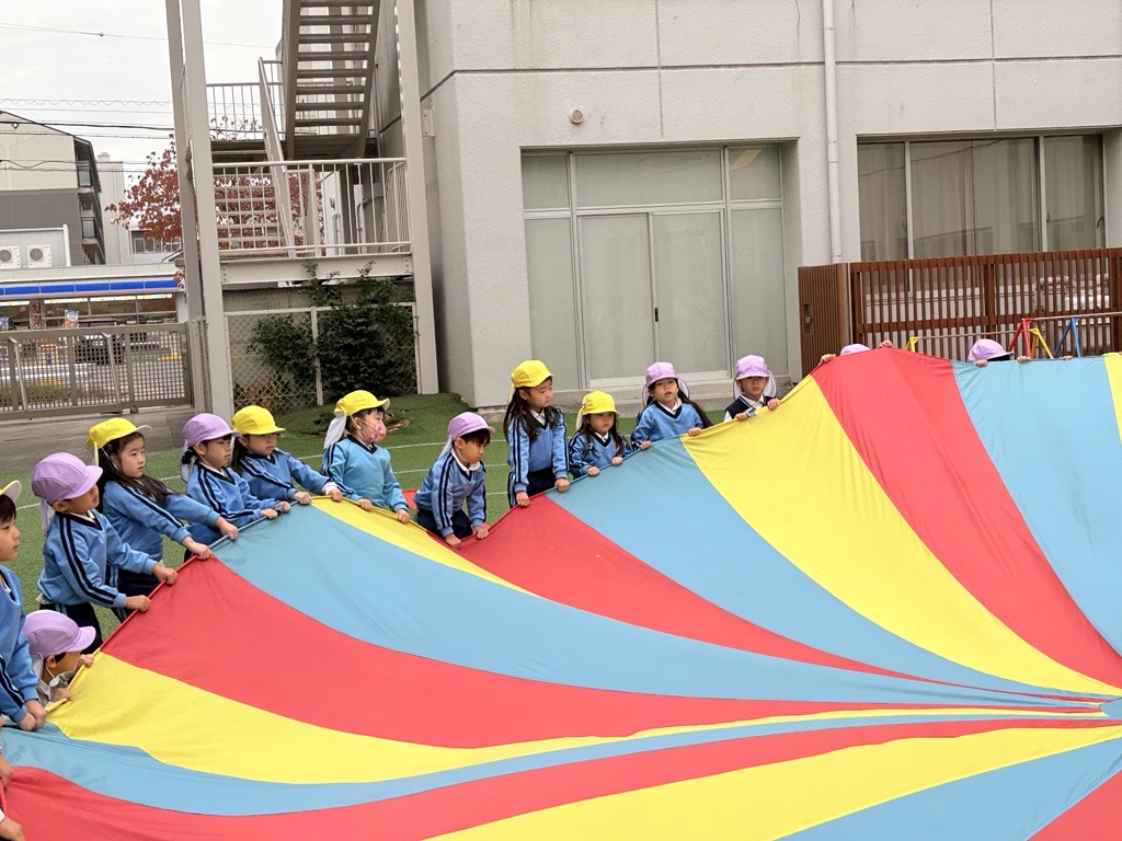 運動会が終わり、運動会ごっこをして遊んでいます。憧れのリレーや、年長組さんの遊戯を遊びの中で取り組むと「バルーンもやってみたい!」「年長さんのバルーン触ってみたいな!」と子ども達から話が出てきました!そこで年長組さんにお願いすると一緒にやってくれることに・・・!