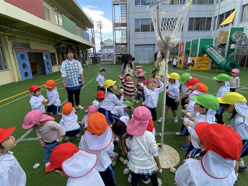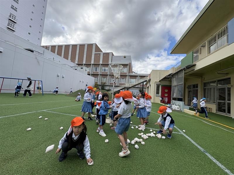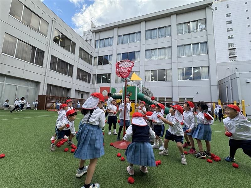りんご組対みかん組で玉入れをしました。「エイッ」と声を出して頑張って投げています。