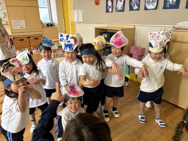 ハロウィンのおばけごっこをしたよ!ひよこ組が来たよ!おどかしちゃえ!! 皆で考えた遊びの楽しさを共有することで、大勢で遊ぶ面白さを感じ「またやりたい!」「また、おもしろいこと考えよう!」の気持ちにつながります。