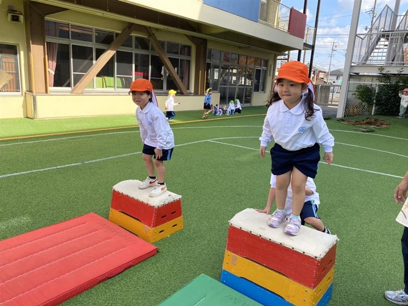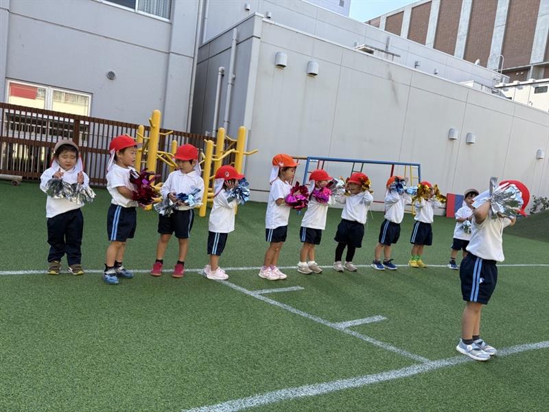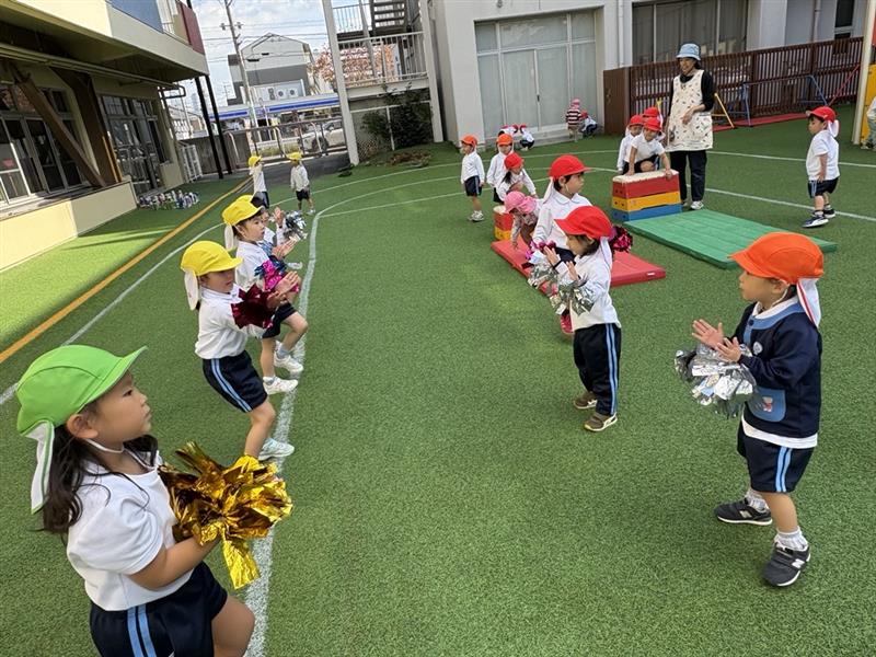 年中組や年長組のお兄さん、お姉さんがしていた玉入れやキラキラのポンポンを持っての遊戯、跳び箱を憧れの眼差しで見ていた年少組さん。運動会ごっこでお兄さん、お姉さんに教えてもらったり、「カラフルNo.1」を一緒に踊ったりして楽しんでいます。