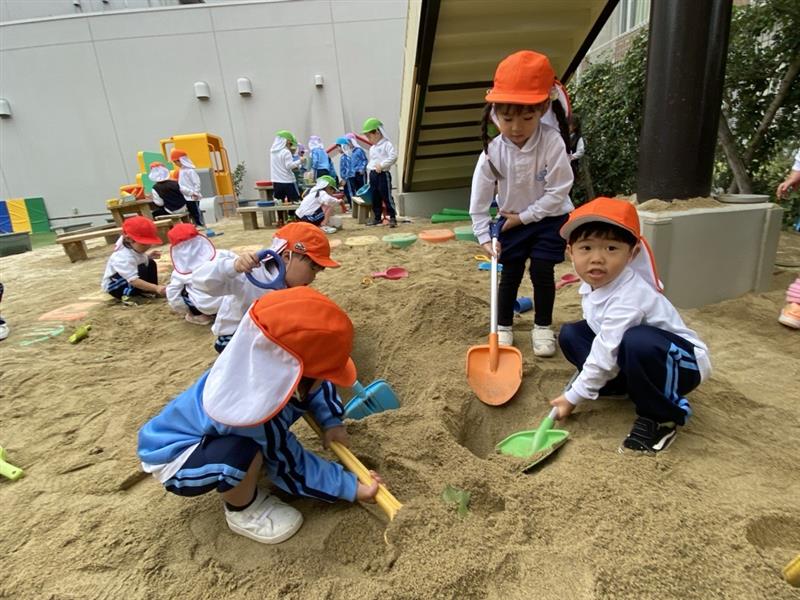 「もぐらがいるよ!」「こっちはネズミの穴だよ」と話しながらイメージを膨らませて遊んでいます。言葉に表すことでどんどん遊びが広がります。