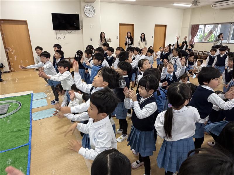 しゃぼん玉をタワーのように高く積みあげたり、大きなしゃぼん玉を作ったり、しゃぼん玉の中に入ったりしたよ。