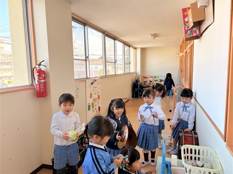 楽器遊びが始まり、いろいろな曲に合わせて好きな楽器を鳴らして遊んでいます。先生役になって「カスタネットさん!」「はぁい!」と楽器を使って返事をしたりして演奏しています。