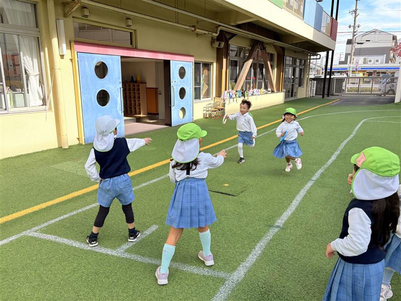 運動会ごっこが終わってもリレーがやりたいと自分たちでコーンやバトンを用意して走っています。次に走る子が友達の名前を呼んで待っていたり、同じチームの仲間を応援したりして楽しんでいます!