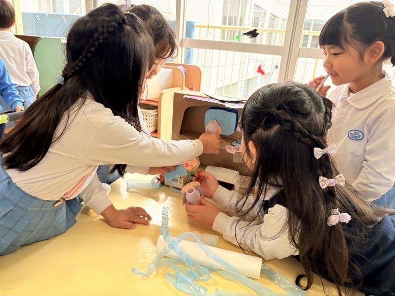 段ボール箱を家に見立てドールハウスを作って遊んでいます。ヤクルト容器に画用紙を切った顔や服を付けて人形を作ったり、家の中に必要なものを友達と考えてテレビやベッド、机を用意して人形を動かして楽しんでいます。「階段はここに着けよう!」「滑り台も付けたいなぁ」と、楽しそうな夢の家ができ上がりました!友達と一緒に作るものを考え形にしようとしたり、思いを言葉にして相手に伝えながら遊べるようになってきました。