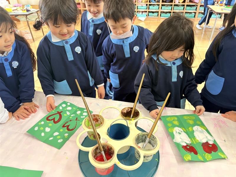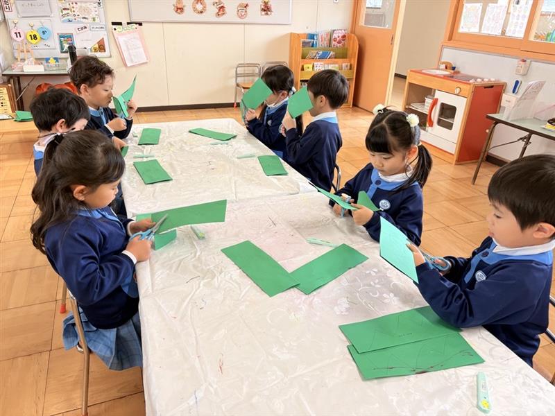クリスマス製作をしました。画用紙にデカルコマニーの技法で模様を付け、ハサミを使ってツリーの形に切りました。以前より絵の具もハサミの使い方も上手になりました!