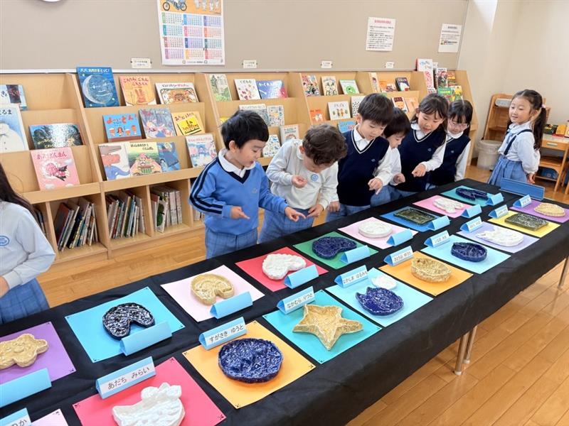 年長組さんの陶器を見に行きました。部屋に入ると「うわぁ!すごーい!」「これ作ったの?!」と興味津々!かわいいお皿、自分の知っているキャラクターのお皿を見つけると「どうやって作ったんだろう。」「こんなの作ってみたいな」と話していました。