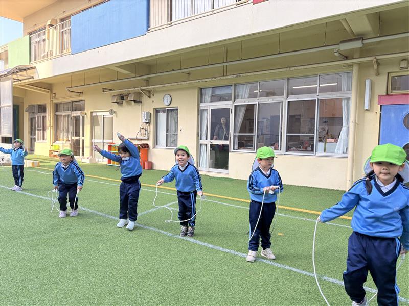 トライルで縄跳びを経験し、遊びの時間にも練習している姿が見られます。『縄を回す・跳ぶ』の動きを同時にするのが難しく何回も何回も繰り返し挑戦しています。