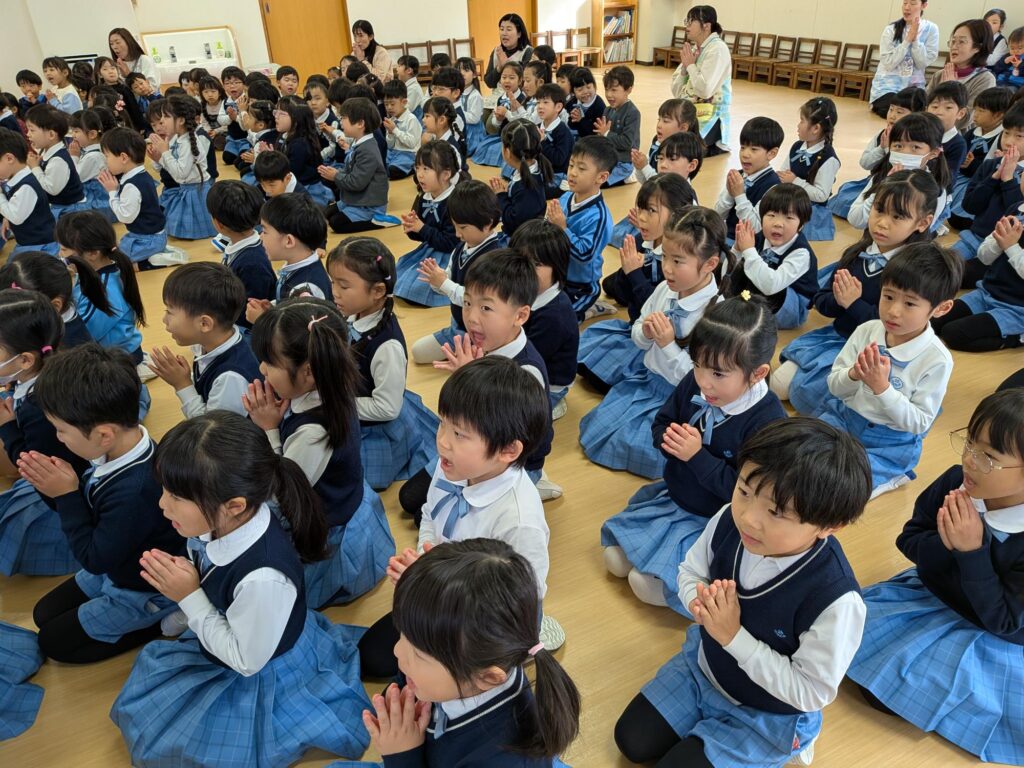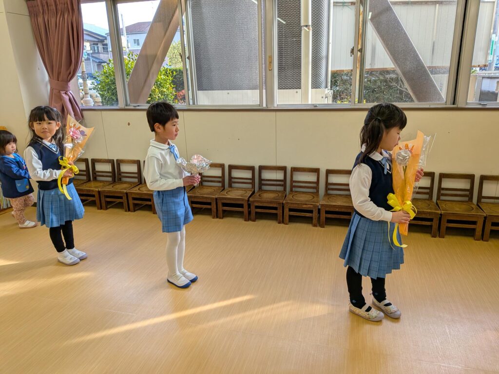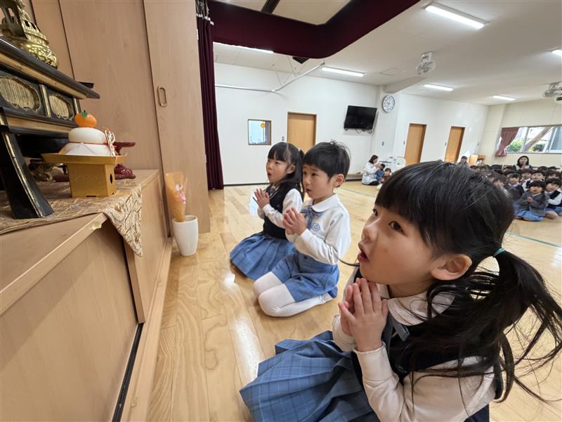 遊戯室で3学期の始業式を行い、年長組が献花献灯を行いました。