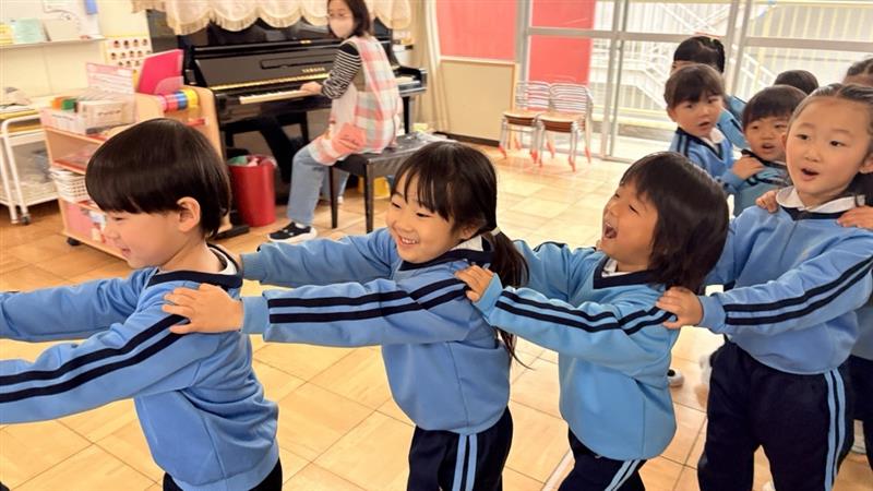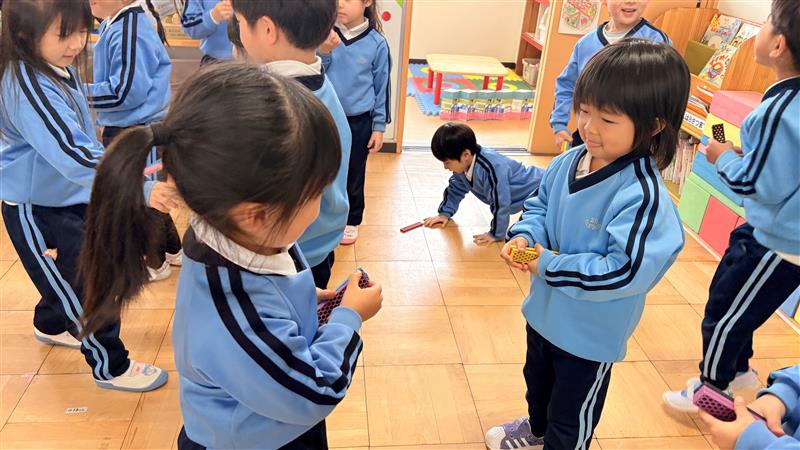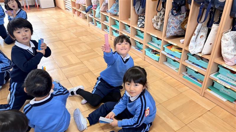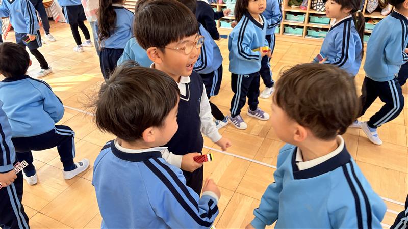 今日はきりん組・ぱんだ組で一緒に集団ゲームを楽しみました。みんなの大好きなじゃんけん列車をした後は、『ビオブロじゃんけん』をしました!