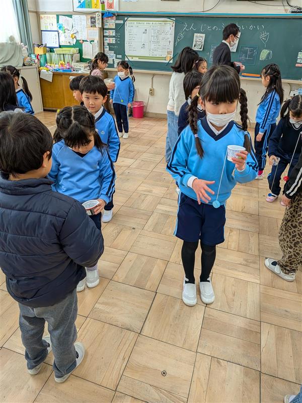 1年生から手作りのけん玉をプレゼントしてもらい、やり方のコツを教えてもらいました。