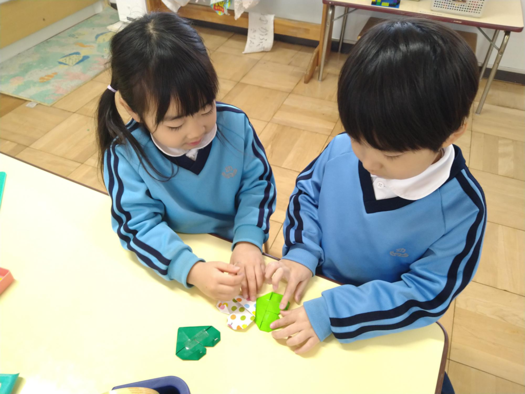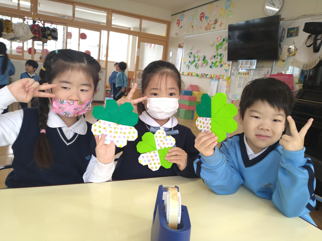 一人2枚の折り紙でハートを折り、『四つ葉のクローバー』を二人で協力して完成させました。年長に向けて協力して楽しむ活動を取り入れて行きたいです。
