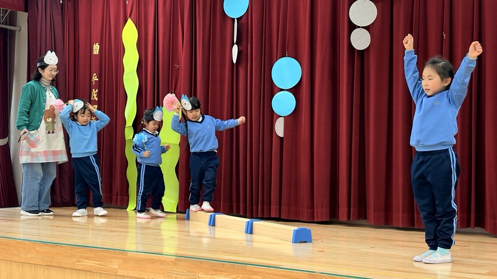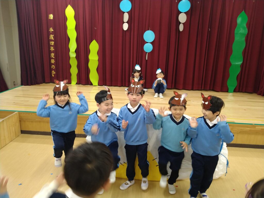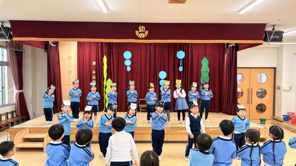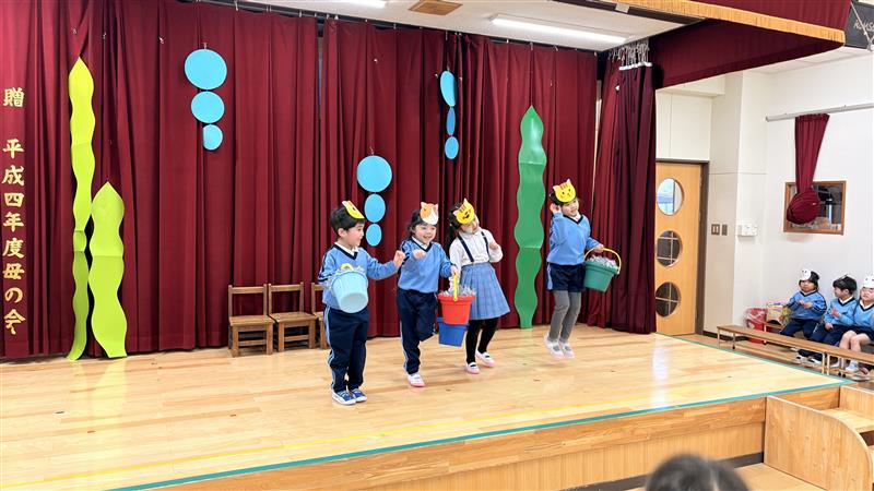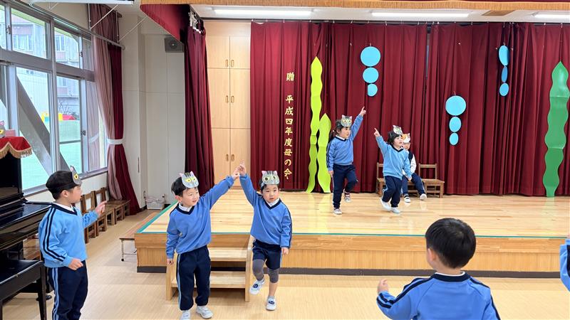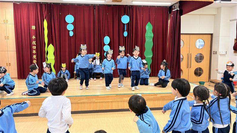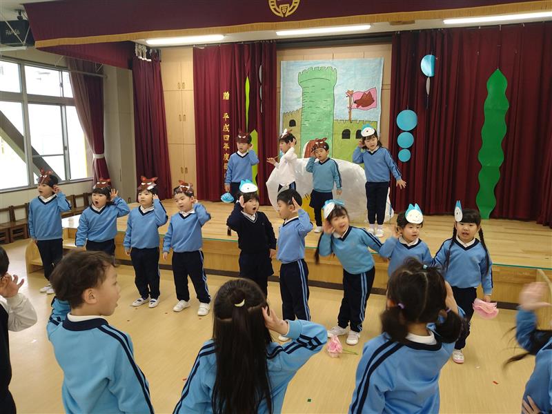 交換して劇遊びをすると互いのクラスの役のセリフや動き、出番など細かいところまで覚えていることに驚かされました!セリフに困っていると子どもたち同士でセリフを教え合ったり、好きな曲は皆で歌って踊ったりしてとても楽しんでいました☆