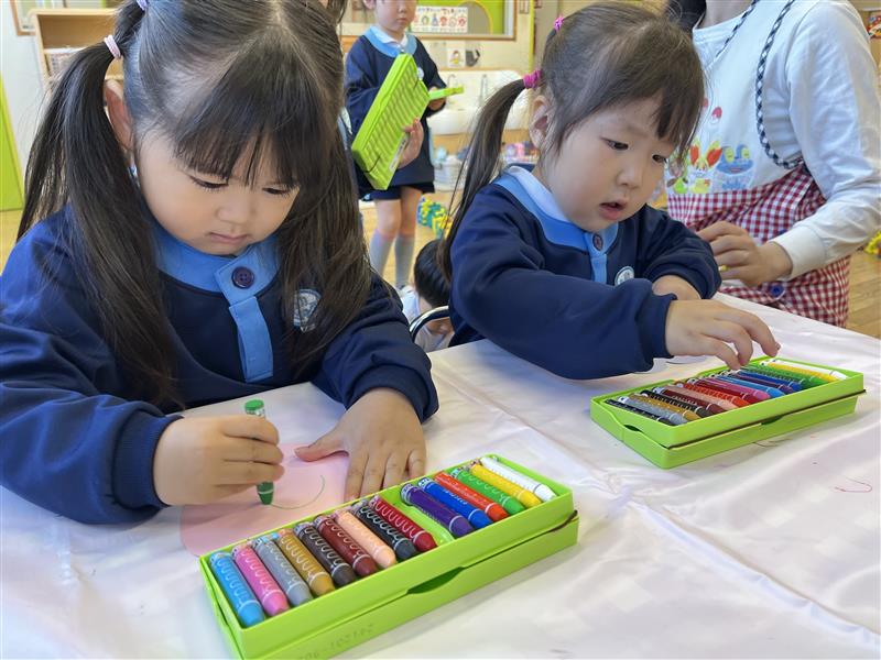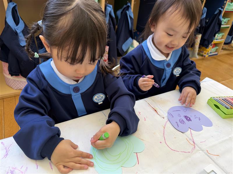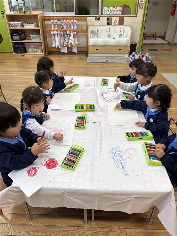 絵画では、ぐるぐる描きで動物を描きました。描きたい動物を考えたり、好きな色を手に取ったりしながらぐるぐるクレヨンを回して動物を描き、かわいい動物が完成☆「できた!」と嬉しそうな表情が見られました。