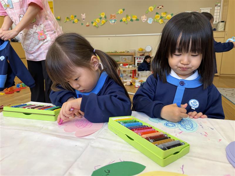 春の壁面製作として、チューリップを作りました。4色の中から画用紙を選んで、クレヨンでぐるぐる描きを楽しみました。春のかわいらしいチューリップが完成しました。