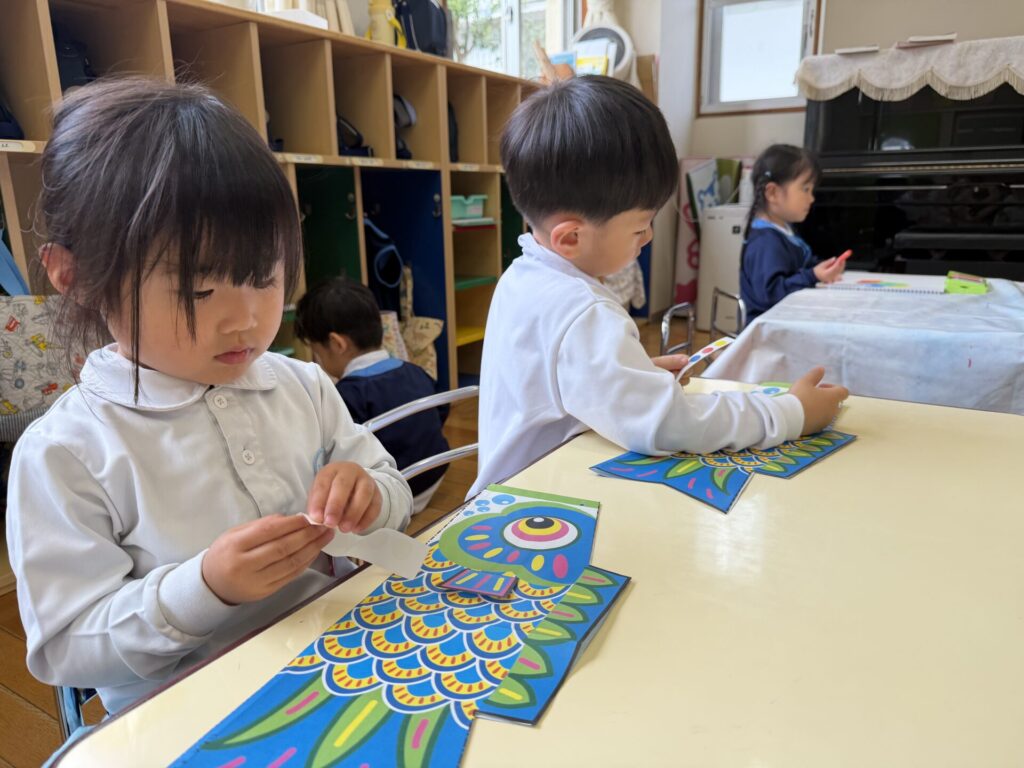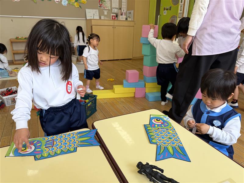 手先を使ってシールを貼り、こいのぼりを作りました。一人ひとりシールをどこに貼るか考え、並べて貼る子やバラバラに貼る子など様々で、かわいいこいのぼりが完成しました。